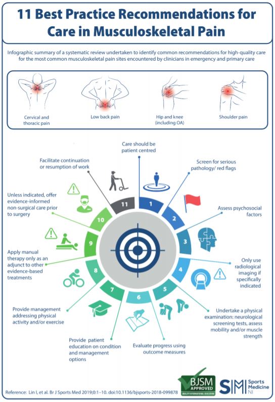 - Lin I, Wiles L, Waller R, et alWhat does best practice care for musculoskeletal pain look like? Eleven consistent recommendations from high-quality clinical practice guidelines: systematic review British Journal of Sports Medicine 2020;54:79-86.